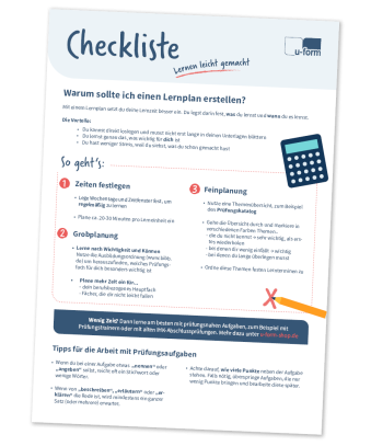 Der u-form Prüfungsrechner berechnet die Noten für die einzelnen Prüfungsteile und die Gesamtnote für die Abschlussprüfung. Gib deine erreichte Punktzahl der jeweiligen Prüfung an (0-100), bei noch nicht geschriebenen Prüfungen klicke bitte auf den nebenstehenden Haken, um das Feld auszublenden.